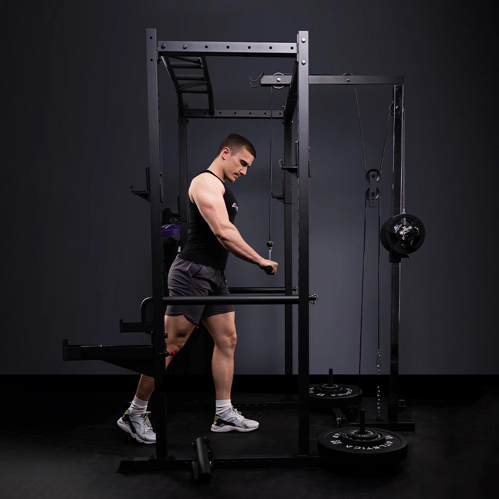 Ein R5 Power Rack ist ein vielseitiges Krafttrainingsgerät von ATLETICA, das für Übungen wie Kniebeugen, Bankdrücken und Klimmzüge verwendet wird. Es bietet Sicherheit und Stabilität durch verstellbare Sicherheitsstangen und ist ideal für intensives Training.