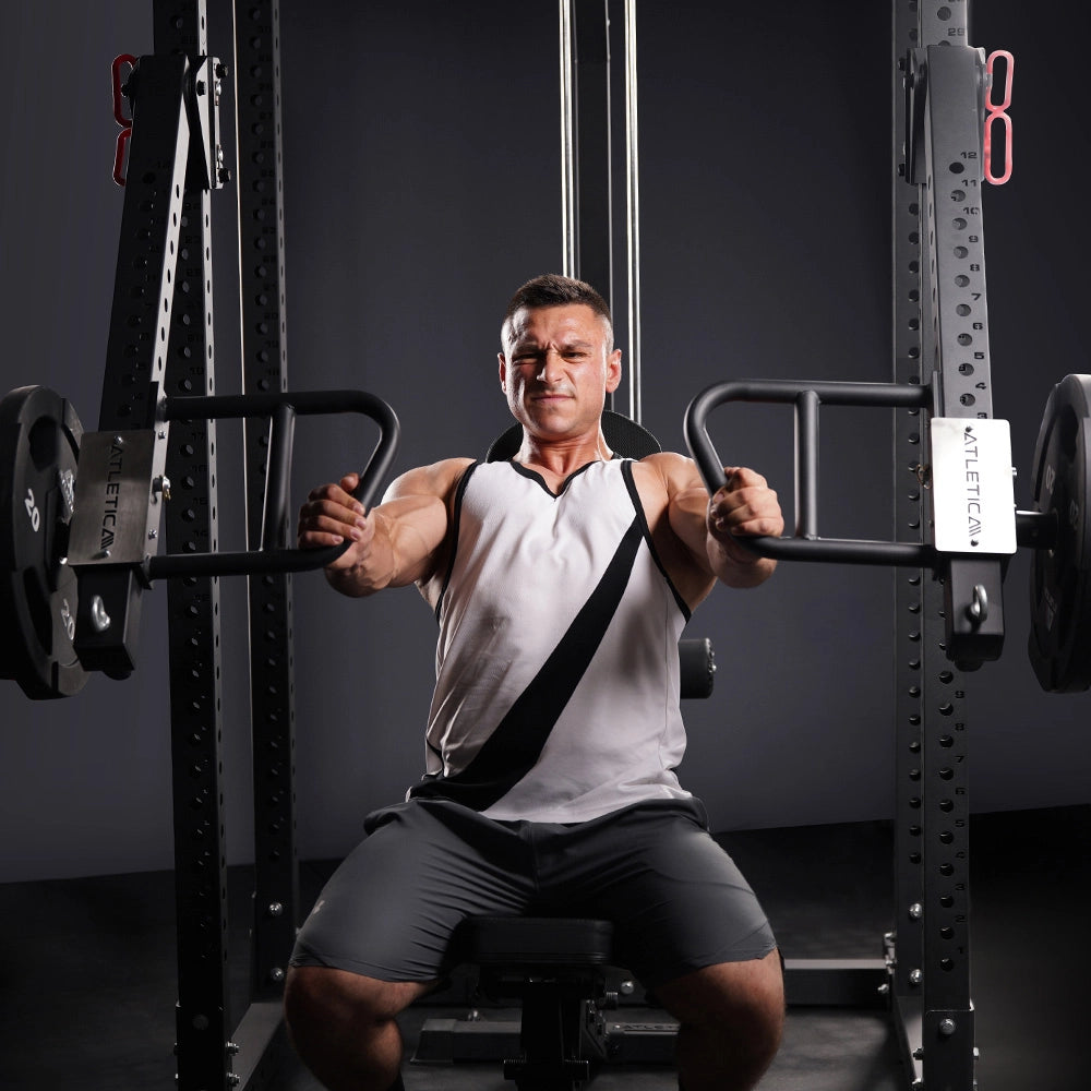 Ein R7 Power Rack ist ein vielseitiges Krafttrainingsgerät von ATLETICA, das für Übungen wie Kniebeugen, Bankdrücken und Klimmzüge verwendet wird. Es bietet Sicherheit und Stabilität durch verstellbare Sicherheitsstangen und ist ideal für intensives Training.