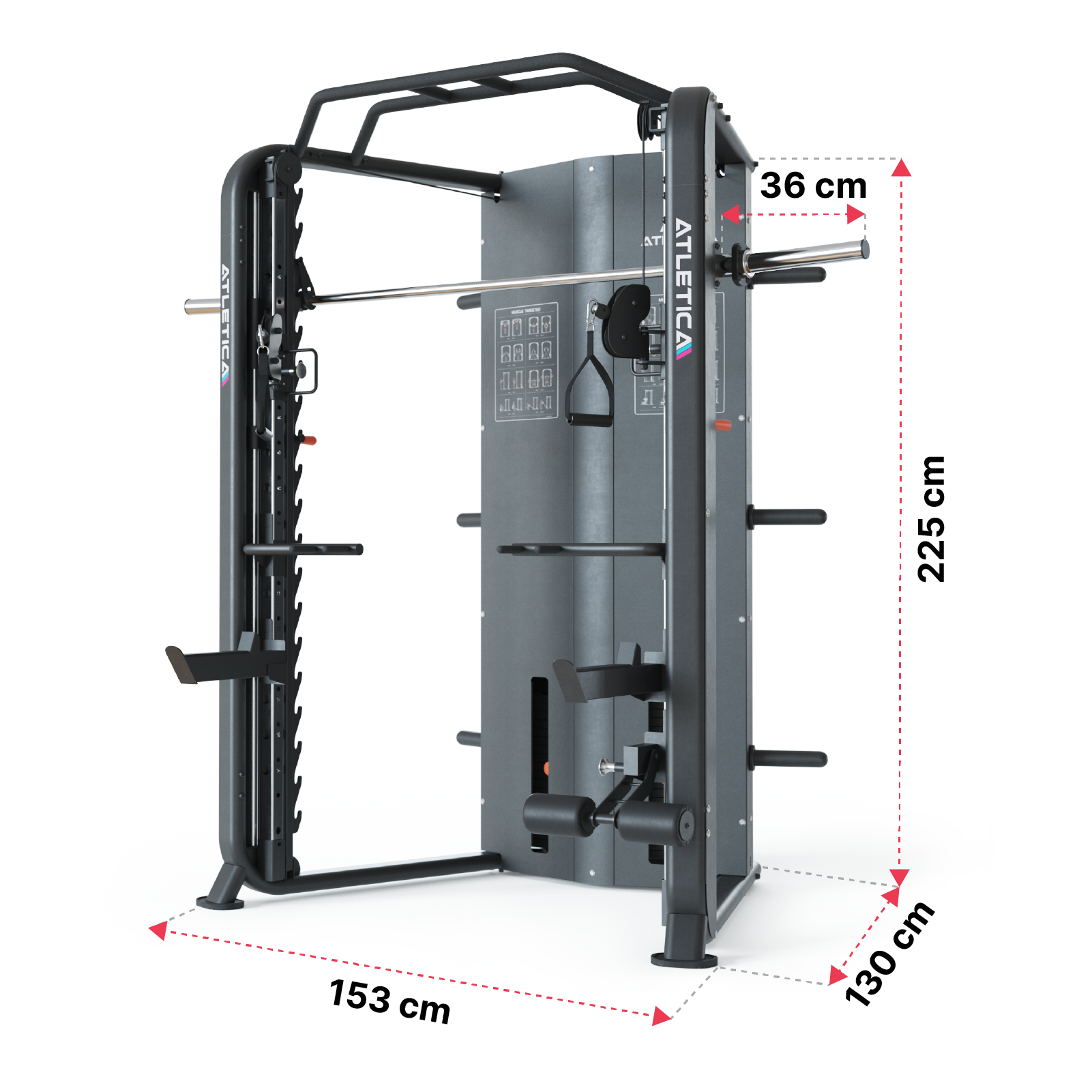 | Breite | 153cm (220cm inkl. Langhantel der Smith Machine) |