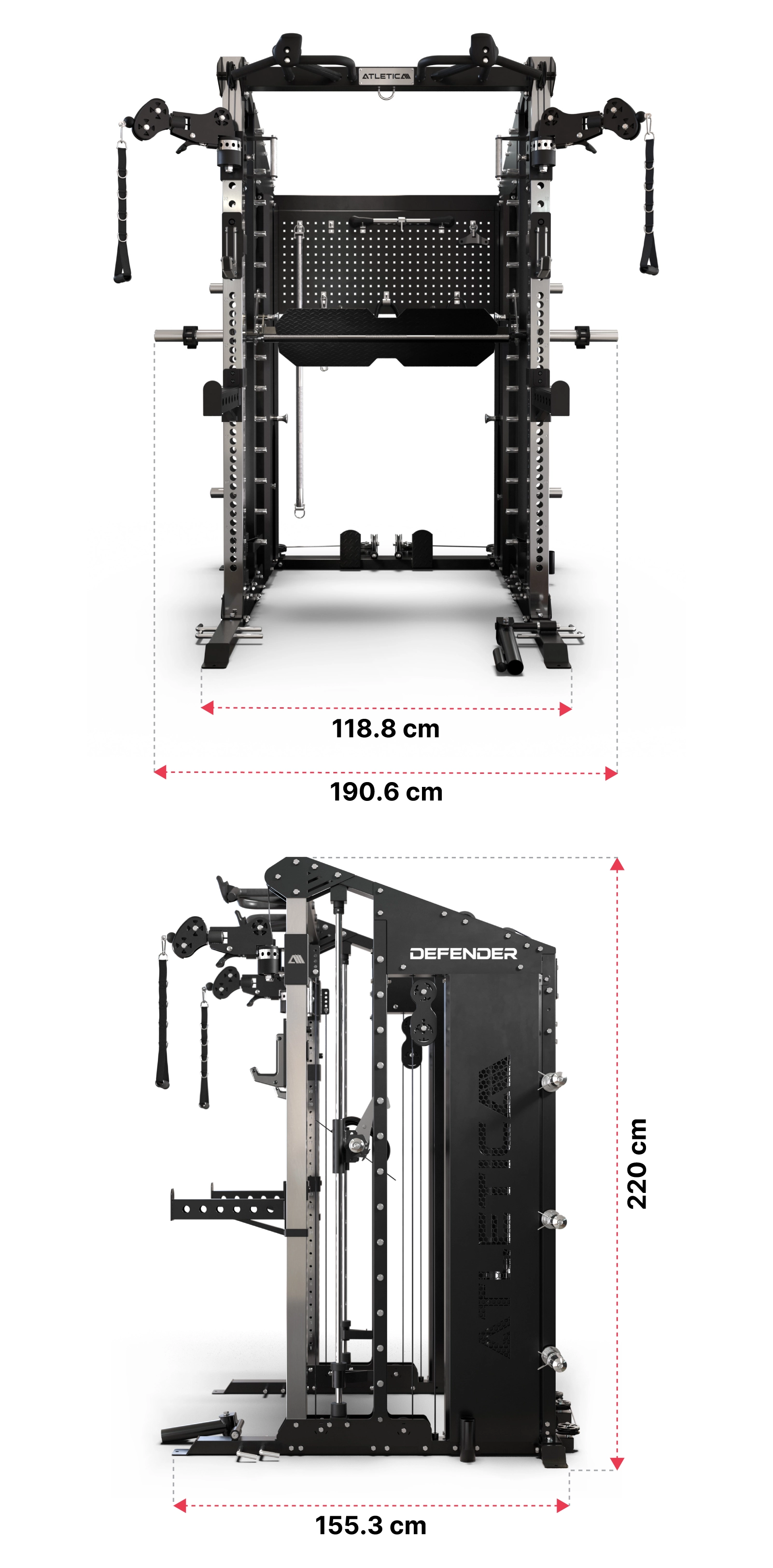 | Zubehör | Latzugstange, Short Bar, Landmine Attachment, Band Pegs, Ruderplatte/Fußplatte, Einzelgriffe, Fuß-/Knöchelgurt, Trizepsseil, Beinpresse-Modul |