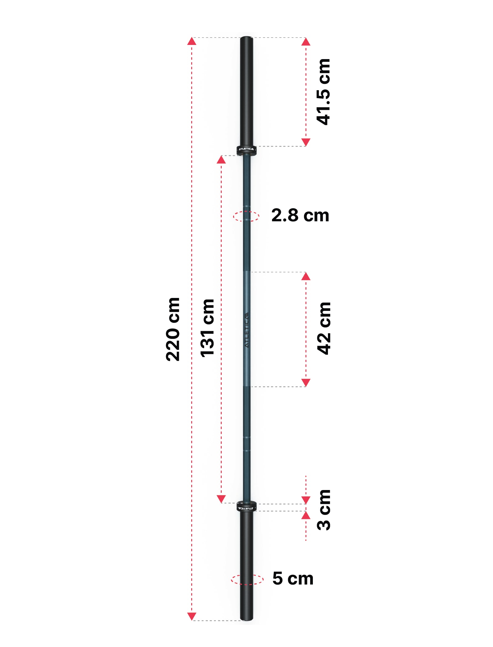 Klasssische Maße von 2200 mm Länge und 20 kg Gewicht und einem Griffdurchmesser von 28 mm. Optimale Allround Langhantel für Gewichtheben, Powerlifting und Funktionellem Training in deinem Home Gym.