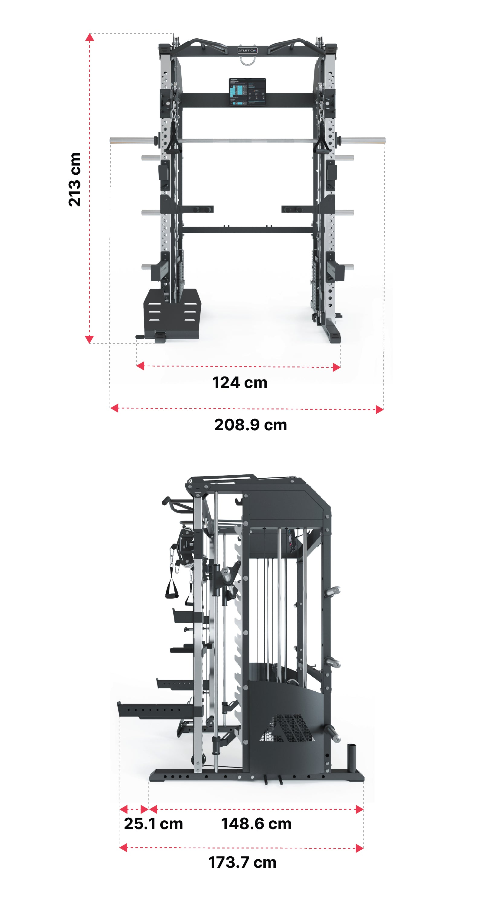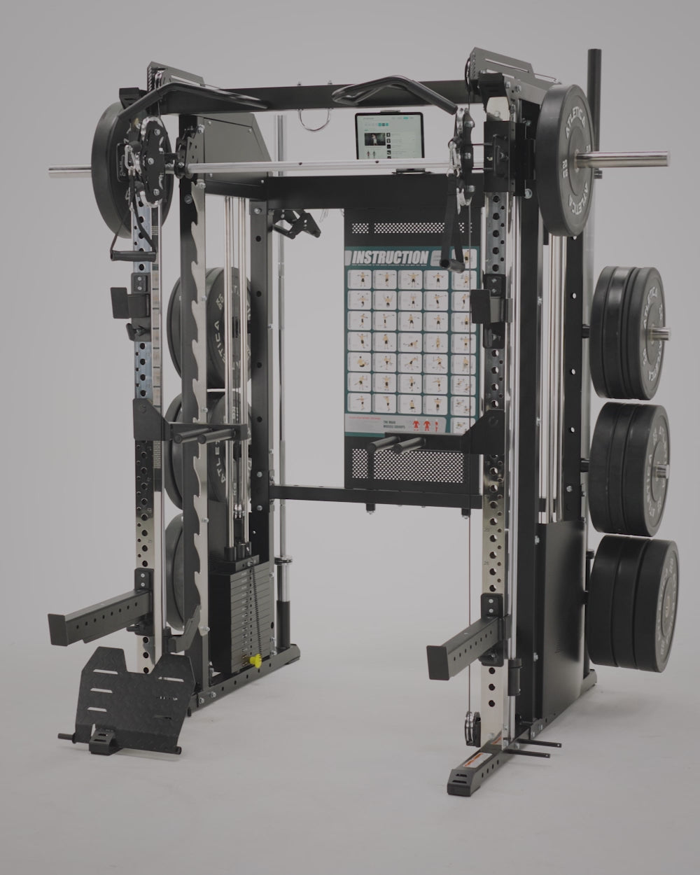 Kombiniert Cross-Over-Kabelzug, Power Rack und Smith-Maschine in einer einzigen Station.