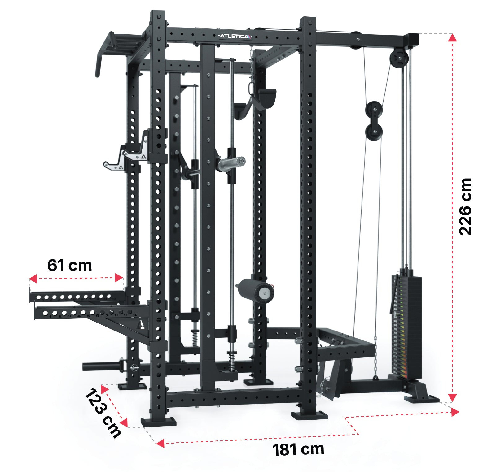 Vereint Power Rack, Smith Machine und Latzug mit 125 kg Steckgewichten in einem Gerät.