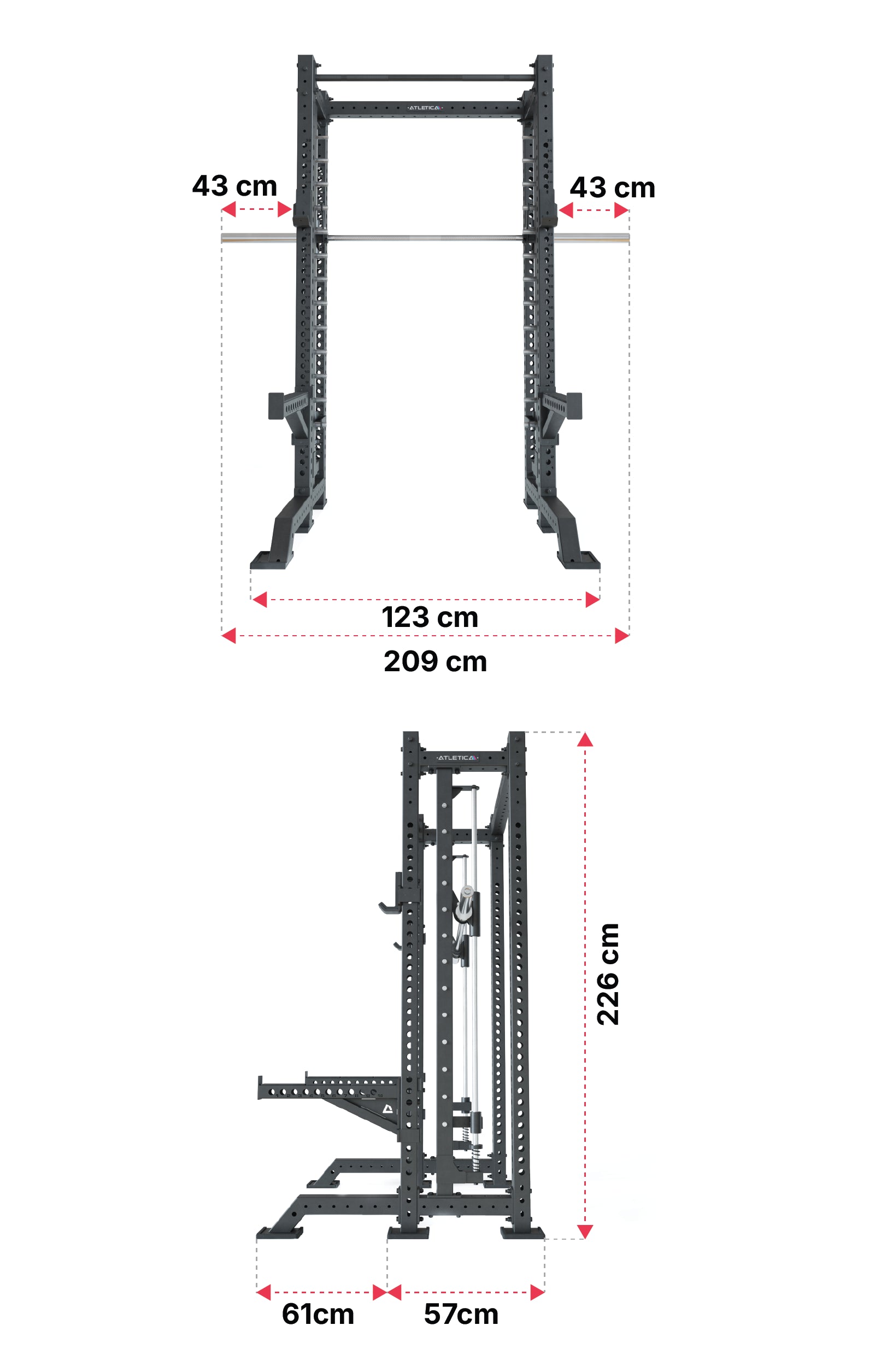 | Tiefe | 57cm Power Rack + 61cm Front-Stabilisatoren (optional +88cm Latzug) |