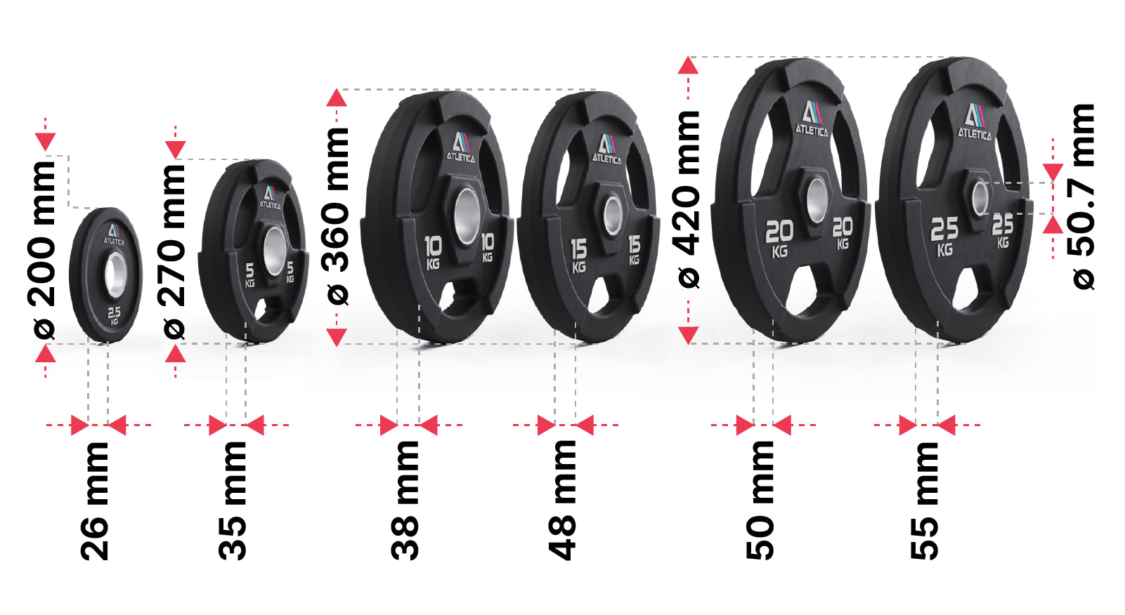Mit einem Durchmesser von 42 cm sind selbst die beiden größten Scheiben mit 20 kg und 25 kg um 3 cm kompakter als herkömmliche Bumper Plates.