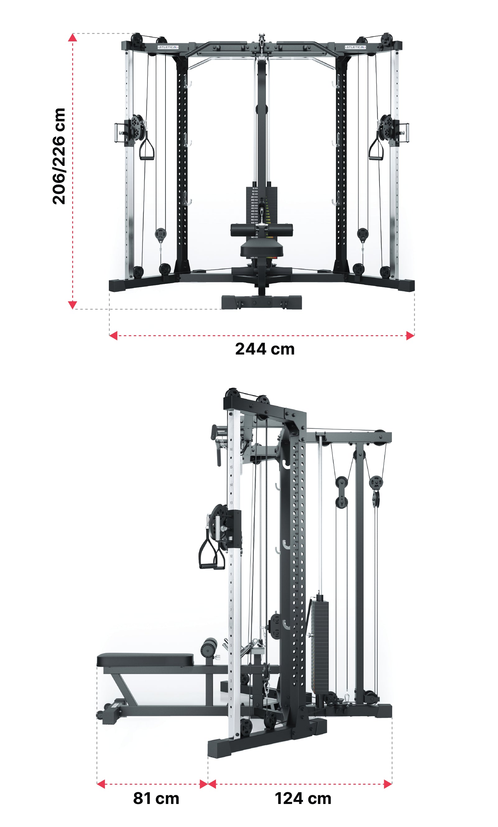 * Ich habe die Variante in LOW, 206cm. Ich bin 184cm groß, normale Armlänge, und kann auf der Latzug-Bank sitzen und mich knapp voll in Streckung ziehen. Daher für mich ok! Wer größer ist, vermisst ggf die 20cm Höhe und sollte die HIGH variante wählen, wenn die Decke das zulässt.